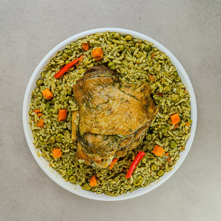 Tasty chicken, pieces of carrots, pepper and peas , seasoned with garlic, yellow, pepper, cilantro and spinach.